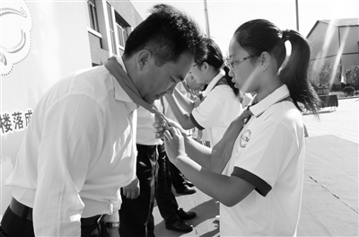 仅仅用了52天,建筑面积3000多平方米、配套设施完备的军庄中心小学二层教学楼拔地而起。在9月7日举行的军庄中心小学2015学年度开学典礼暨军庄中心小学新建教学楼落成仪式上,校长张秀明高兴地说,“咱们的楼太漂亮了,两个月时间变化太大了。代表学生和学生家长感谢区政府、感谢北京住总集团的抢险参建者,让大家搬进新校舍。”图为小学生为杨海啸青年突击队队长杨海啸系上红领巾。