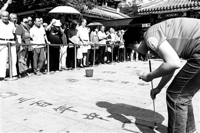 昨天,第十届北京公园季 “地书”比赛活动拉开了序幕。40名中老年选手,按照楷书、行书、草书、篆书四种笔体进行了比赛,以“祖国华诞”、“陶然亭公园对公众开放60周年暨陶然亭建亭320周年”为主题进行书写,将自己对祖国的热爱、以及对陶然亭公园的美好祝福融入其中。本报记者 邱勇 摄影报道