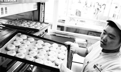 昨天,稻香村的糕点师将月饼烤制“转移”到门店,让大家品尝刚出锅的“现烤月饼”。记者在北京稻香村第十四营业部看到,现场烤制月饼柜台前排起了长队。有的顾客刚从售货员手里接过月饼就迫不及待吃了起来。据悉,目前只有稻香村第十四营业部外,第二十二、十八营业部出售现场烤制月饼。