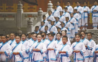 昨天,在具有700多年历史的孔庙大成殿广场前,一场庄严的“释菜礼”拜师仪式拉开了第五届北京孔庙国子监国学文化节的序幕。当天,东城区委、区政府在孔庙大成殿前举办庆祝教师节表彰活动,近700名优秀教师获表彰。此次活动与孔庙国子监国学文化节相结合,不仅具有发扬中华民族传统美德——尊师重教的历史意义,还具有提升当代教师荣誉感和使命感的现实意义。据了解,为期20天的国学文化节将陆续推出11项国学精品活动。