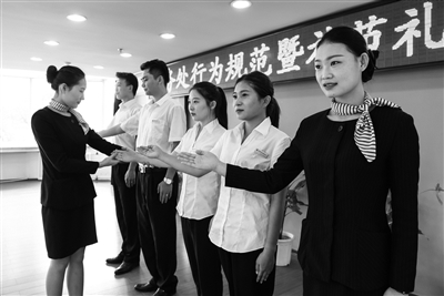 昨天,北京房地集团首华物业管理有限公司开展职工行为规范和礼仪培训。来自北京饭店的礼仪专家现场进行讲解,纠正大家日常的姿势和行为举止。据介绍,开展礼仪培训,旨在培养职工在日常工作中的行为举止,提升企业的形象和服务水平。本报记者 邱勇 摄影报道
