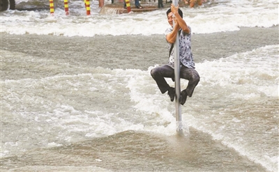 9月2日消息,杭州钱塘江珊瑚沙水库段,凶猛的“鬼王潮”冲上岸来,游客纷纷躲闪,一名机智的游客爬上了路标杆躲避潮水。