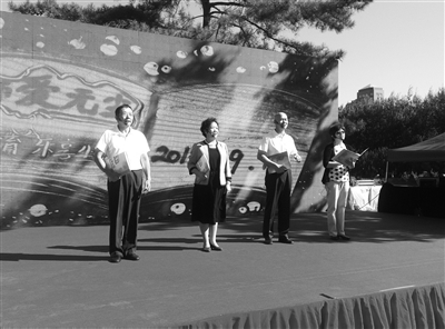 刚过去的周末,“师爱无尘——守望教育 乐享生活”2015年教师节大型公益活动在朝阳区红领巾公园举办。现场安排了名师教育咨询、教育大讲堂、健康咨询、亲子游戏等一系列精彩的活动项目,为教师搭建服务家长、奉献社会的平台,创设尊师重教的空间。图为朝阳区四位退休教师进行诗朗诵《我期待一个更好的你》。本报记者 任洁 摄影报道