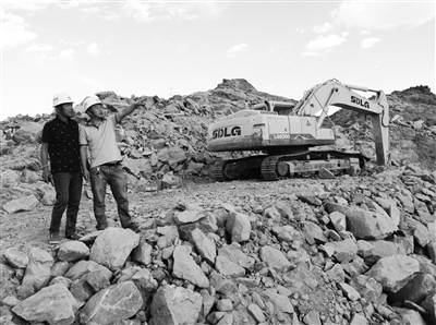 三工区一部分在戈壁滩上,一部分则需要穿越山区。小山丘上,挖掘机正卖力地将爆破后石头挖出来。三工区施工队长何彪,则在现场盯着,查看挖掘机工作情况。看看挖掘机操作都符合规范后,何彪又赶往下一个点查看。