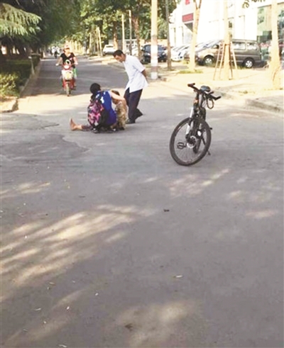 目击者说,当时她和室友去淮南师范学院吃饭,与小袁对向而行。事情发生之前,她看到老人走路不稳,一崴一崴的。后来,小袁骑车从老太身边经过,但不知道什么原因,老太就倒地了。当时小袁骑车已经过去了,老太又喊住小袁,小袁把车子停下,将老太扶着坐了起来。她当时犹豫是不是过去,后来还是过去了,和小袁一起帮老人揉腿。