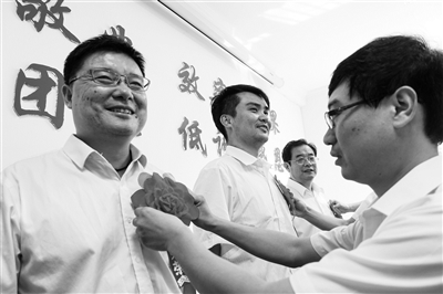 昨天是北京房地产集团首华管理公司服务处南沙沟物业站站长姜鹏激动的日子,在公司举行的拜师仪式上,29岁的他首次收徒,当天同他一起当师傅的还有服务处其他两名项目负责人。仪式上,徒弟亲手将大红花佩戴在师傅胸前,传承管理和服务经验。本报记者 邱勇 摄影报道