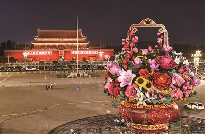 中秋、国庆佳节即将来临。记者昨天在天安门广场看到,直径40米、高16米的花篮主体已经搭建完成。据介绍,今年天安门广场中心花坛主题为“祝福祖国”,沿用了大型花篮造型,在花材选取上首次采用了中国传统十大名花造型,用花量8万余株。同时,今年中心花坛大花篮篮体灯光将采用激光投影灯,能在夜间勾勒出牡丹花的轮廓,并且能动态改变颜色。两侧绿地花柱采用图案投影灯,可以映射出祥云、菊花、竹子等中国传统元素图案。本报记者 邱勇 摄影报道