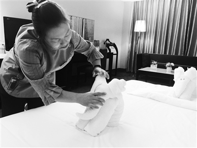 不只是摆放运动员的照片,床上还用毛巾折叠了玩偶。大象、小兔子、天鹅、小狗……一个个活灵活现,憨态可掬。“这是中心组织到同行业酒店学习交流时看到的,拍了各种造型的照片回来,然后我用毛巾一步步试,最后折叠出来。”续娟说。续娟研究明白后,再教给敦亚娟、呙琼芳两位领班,她们都是今年刚成立的客房技能工作室的成员。
