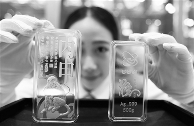昨天,一名菜百员工在向喜爱收藏的市民展示2016丙申(猴)年贺岁银条。