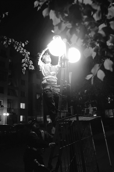 晚上10点多,小黄面包车驶过羊毛胡同,这条南北向的小巷不足3米宽。“我记得这里有路灯来的,怎么黑了?”张福明让司机把车开了进去。果然,灯杆上的灯泡灭了。“得嘞,干活喽。”同事高雷麻利地从车上蹦了下来,挪了挪杆下的垃圾桶,戴好安全帽,上好脚扣,一步一步爬上杆去。张福明在下面用手电照着,指挥监护:“看看是不是保险松了?”高雷在上面熟练地摆弄了几下,灯亮起来了。