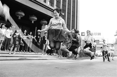 在打沙包的比赛项目中,每个队派10名队员,由对手扔沙包,被沙包击中即淘汰下场,剩下队员最多者获胜。10人跳绳比赛比的是一分钟内成功跳绳的次数,10个人同时起跳,队员之间的配合要求更高,最多的队也只跳到二三十个,但是一点不影响队员和观众的热情,有的队员把鞋都跳飞了出去,观众们一时笑弯了腰。