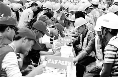 中秋佳节本是一家人团圆的日子,然而在城市工地上,农民工们不能与家人团聚。考虑到工友们的思家之情,中建三局成都公司某项目的60余名员工自发组成 “代写家书志愿者”,为工地上800余名农民工代写家书。(9月28日《天府早报》)