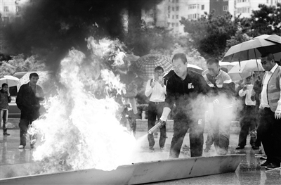 昨天,由亚运村街道工委组织科、街道综治办、街道总工会及各商务楼宇服务站主办,中京安顺消防科技有限公司承办的消防知识宣传暨演练活动冒雨举行。200多位非公企业职工代表到场学习,并体验了灭火器的使用方法。本报记者 任洁 万玉藻 摄影报道