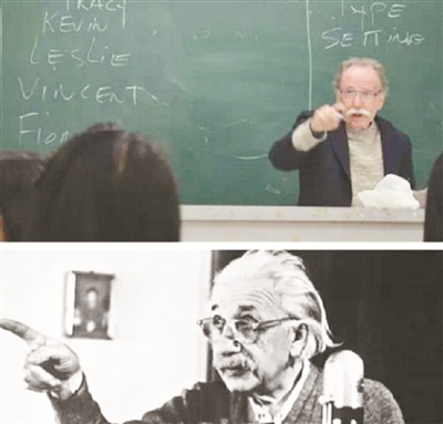 近日,福建农林大学海外学院一位外教,因外形酷似爱因斯坦而在微博上走红。 这位外教来自美国,负责英语和社会学的教学。由于他英文姓氏中的Manzo与汉语“慢走”发音相似,同学们都称他为“慢走”教授。这是微博上走红的照片,图片拍摄者将加里·曼左(上)与爱因斯坦的照片拼版进行对比。