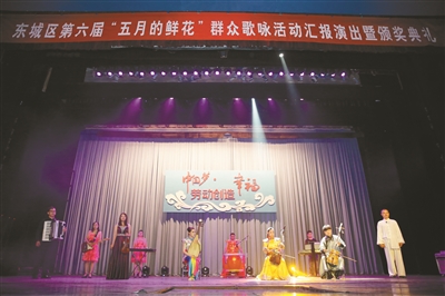 9月21日,东城区第六届“五月的鲜花”群众歌咏活动汇报演出暨颁奖典礼在崇文工人文化宫举办。各有关单位领导、工会干部、劳动模范和职工代表近500余人观看了演出。