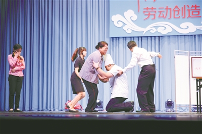 今年的活动突出了“劳动创造幸福”的主题,全国先进工作者、区环卫中心三所三八女子抽粪班班长李学玲,全国劳动模范便宜坊烤鸭传承人白永明,全国劳动模范黄永强为获奖单位和个人颁奖。在舞台上圆了梦想的普通职工,从全国劳动模范的手中接过奖杯,将“劳动创造幸福、同圆心中梦想”的主旋律推向高潮。