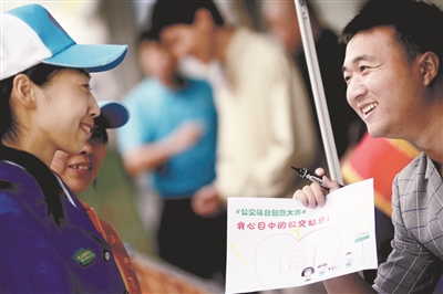 由公交集团发起的“公交站台站杆站牌创意设计大赛”面向社会“众筹”公交站台创意设计,广泛征集市民对公交站台设施的意见和建议。记者昨天在北京南站公交枢纽的站台上看到,来自特8路内环车队的青年志愿者们摆放了“路路通”咨询台,张贴了关于站台创意设计大赛的宣传海报,向来往的市民发放宣传材料,并向他们征集有关站台设计的好创意好点子。