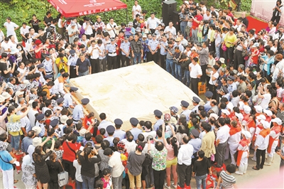 近日,一块8吨重超大豆腐亮相安徽淮南豆腐文化欢乐汇活动,这块豆腐长3.64米、宽3.62米、高0.4米,由50余名工人,耗时7个小时制作完成。图为游客在观看重达8吨重的超大豆腐。
