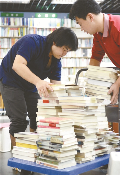 晚上10点,值班经理张喆和10几名员工正在忙碌着。他们有的在整理书架,有的帮助读者找书,有的从仓库里把新书搬运到架上……