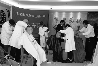 在敬老院,平时开出租的的哥的姐们拿起理发推子,为老人们理发。虽然不是很专业,但他们格外认真,一边和老人聊天,一边理发,现场气氛非常和谐。