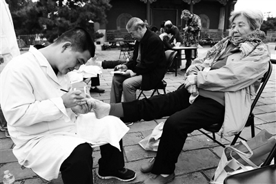 昨天,在东华门普度寺大庙广场,几名专业修脚师为该社区的老志愿者义务修脚。当日,东华门街道组织了义务理发、修表、老年维权咨询、医疗咨询等系列敬老服务活动。来自天坛医院、中建三局、同仁堂王府井中医医院等单位参与了敬老服务项目。本报记者 陈艺 摄影报道