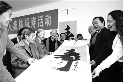 昨天是九九重阳节,丰台区花乡樊家村村内80岁以上的退休老人欢聚一堂,共度重阳节。当天,花乡工会、北京花城春秋书画院为每一位老人赠送“寿”字,祝愿老人们健康长寿。