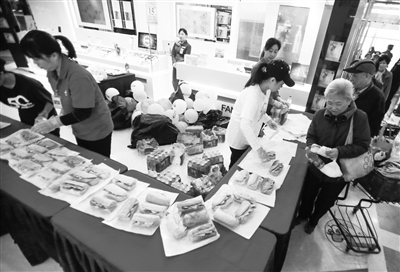 “这么长的三明治,头一次见!”日前,一长70米的“超级三明治”亮相望京新世界商场,围绕商场柜台摆放一圈。记者在现场看到,商场用了一个多小时的时间向附近居民免费发放,共有700多人参与分享。本报记者 邱勇 摄影报道