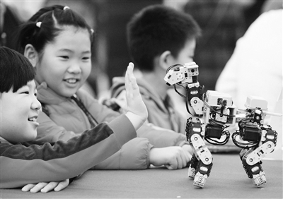 10月24日,在国贸会展中心,孩子们在与机器人互动交流。当日,2015北京国际儿童素质教育及产品展览会拉开帷幕。据主办方介绍,希望通过此次展览搭建起孩子与教育机构的沟通平台,让教育机构有针对性地提供给孩子们个性化教育产品。本报记者 陈艺 摄影报道