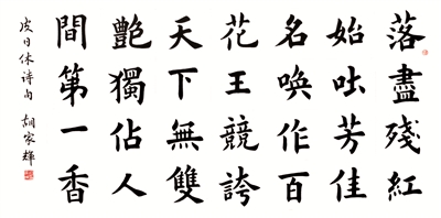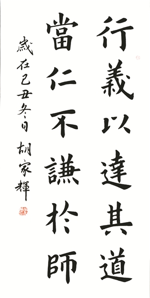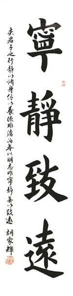 1959年生于北京的胡家辉,自幼迷恋书法、绘画,醉心于京剧艺术。从17岁在北京京剧院担任舞台技师起,即师从康殷、康雍、王学仲、欧阳中石诸多名家。他独具灵秀之气,善于将京剧元素融汇于书法之中,最求象外之意、神韵之美。30余年,遍临晋、唐,精研二王、智永禅师、欧阳询各家风格。楷书敦厚、稳健、富有魏碑风采。行草书刚柔相济、气韵灵动,体现力与美的和谐统一,浑然天成。讲求字外功夫,埋头诗词歌赋,修养文化品格,将“一生不浮”作为自己的座右铭。胡家辉热衷于公益事业,多次为慈善机构捐赠作品,对于书画理论教育也具有独到的见解。其作品被多家博物馆收藏,作品被教育部定为《高中书法教材》。