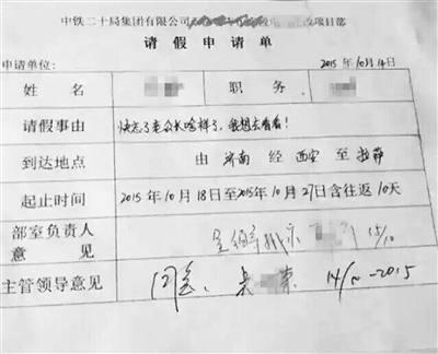 朋友圈里出现了一张令人唏嘘不已的请假条:假条内容是“快忘了老公长啥样了,我想去看看”。假条来看,这位女士从10月18日至27日共请了10天假,要从济南途经西安去拉萨看望他的丈夫。从假条的抬头“中铁20局集团有限公司”来看,这应该是一对长期分在两个项目的一线工地夫妻…… (10月27日人民网)