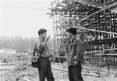 这是我背着照相机在立交桥施工工地的脚手架旁,正与青年突击队的小伙子交谈,请他谈谈突击队重思想素质提高、重向老工人师傅学品质、学技术的情况。