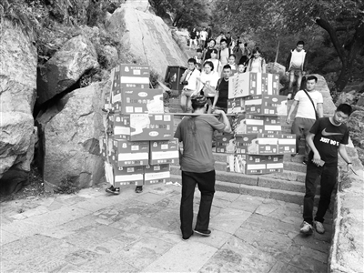 十多年过去了,我以为再也看不到那样原始的劳动画面了。毕竟这些年来科技发展很快,我猜想,应该有更省时省力的方法来运输货物了吧!没想到,这次的泰山之行,竟然让我遇到了现代版泰山上的挑夫。那是在我下山的时候,刚走下泰山的中天门没多远,我正坐在台阶上休息,远远地就望见山下有一个红色的身影在闪动,前面是红的,后面也是红的,却看不清中间的人。只看到人群纷纷闪开为其让道,并在一旁拿出手机啪啪啪拍个不停。慢慢走近了,我才看清那是一个中年的大叔,皮肤白白的,面目清秀,甚至可以说是带着点儿斯文气。这跟我想象中的太不一样了,真怕他会撑不住。但看了一会儿,发现我的担心真是多余,他的步伐稳而不迟,晃而不倒,一步一步走得比旁边的游人还快。虽然不是走出规则的“之”字形,但也是斜着走的,不像我们这些人直上直下,膝盖骨累得不行。大叔的草绿色短衫已经被汗浸湿了,湿了的草绿色变成了翠绿,分外惹眼。