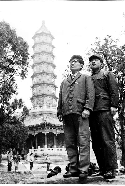 1980年初春的一个周日,乍暖还寒。我们相约一同骑自行车往返20多里到香山公园登山并采风,李振善随身带了一台老式海鸥牌120照相机,装上黑白胶卷,拍了不少自然景色,还请一位游人帮忙拍了几张我们的合影。作为曲艺爱好者,我在厂宣传队常常创作表演节目,其中反映青年民兵抓小偷的快板书小段《夜擒黄鼠狼》,李振善看完觉得作品不错,就帮我投稿刊发在《华北民兵》杂志上。