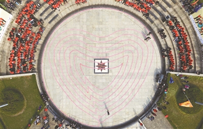杭州市浙江中医药大学杭州滨江校区内,300名大学生及公益使者共同将3004封内装祈福卡的信封连接成一条总长达335.23米的心形信封链条,刷新了今年8月由“全球成长心连心”国际协会组织华人大学生首创的由2409封连接而成的世界最长信封链条。