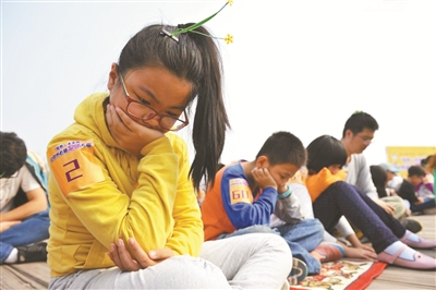 山东省日照市太阳广场,一名头上“长草”的女孩坐在广场上比“呆萌”。选手们坐在指定区域发呆,期间不能看手机、大笑、聊天、上厕所,以及睡觉,坚持时间最长的为第一名,该活动吸引了百余名市民参加。
