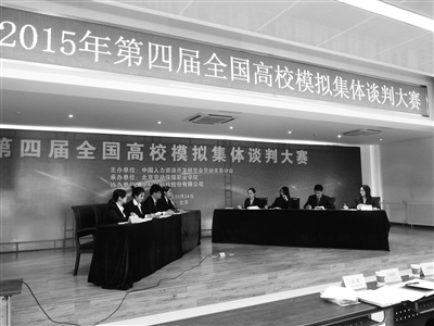 45分钟的比赛时间内,“工会主席”、“基层职工”等组成的劳方代表和“总经理”、“财务总监”等组成的资方代表就员工福利、工资增幅、加班制度等进行谈判协商,以期达成一致意见。近日,第四届全国高校模拟集体谈判大赛在北京劳动保障职业学院举办,来自中国人民大学、中国劳动关系学院、北京劳动保障职业学院等17个本科和大专院校的30支代表队共同参赛,这些未来将走上工会岗位或者从事企业劳动关系管理的高校学生现场体验了激烈的集体协商谈判环节。