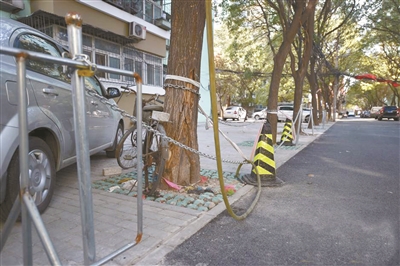 近日,北京定安东里一居民楼小区内6栋楼前的公共花园被部分居民用铁链锁“圈地”,摇身一变成了“停车场”,有的“停车场”还安装了铁门。就连原本是用于居民健身活动的公共场地,也被“圈地”成了停车场,不少健身器材也被挪到了墙角。“圈地运动”让不少居民的出行和停车都很不方便。