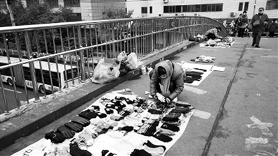 在地坛西门的过街天桥上,每天都有六七个地摊儿固定在此“上班”,成了“常摊儿”,所售商品既无质量保证,也占用桥面影响行人通行。(11月10日《北京日报》)。