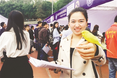 进入11月,重庆大学2016届毕业生秋季双选会在重庆大学思维广场拉开帷幕,在双选会现场,记者还发现一位特别的应聘者。一手拿着简历,一手托着一只通体亮黄的小鸟,自己喝水的时候还给小鸟喂水喝。这名应聘者名叫宋晓旭,是西南大学公共关系专业的研究生。“第一次来参加这种双选会,有点紧张,带着它可以缓解紧张气氛。”宋晓旭称,之所以会带着鹦鹉来投简历,一方面是为了缓解紧张。“面试官即使不喜欢我,也喜欢它(鹦鹉)噻。”