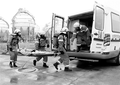 “应急演练现在开始!”,现场解说员一声令下,揭开了北京市2015年突发环境事件应急演练的序幕。演练假设某大型化工厂仓储区工人在巡检时,发现一汽油储料罐发生泄漏,10吨汽油泄漏进入围堰,处置人员在收油过程中,因静电引发泄漏汽油着火爆燃,1人受伤,1人情况不明。随后发生的二次爆炸中,相邻储罐中8吨苯全部泄漏到围堰中,发生接续爆炸的危险性极大!