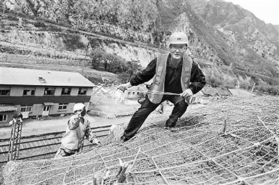 为了防止滚石,几十年来,人们没少想办法。上世纪六十年代,先是试着往山上喷混凝土,坚固倒是坚固了,可所喷之处寸草不生。后来,又砌石头挡石头,再用槽钢抵挡低处的石头,效果也一般。还有一种方法是修建棚洞,就是在危石区的铁轨上方搭一段混凝土的亭子,等于做一段小隧道,这是个好办法,可成本高、速度慢,每修100米得花两年时间。缝山装网,是近几年才有的新技术。铁路用的防护网是纵14毫米、横16毫米的加固钢筋,使用期限达30年,效果杠杠的。