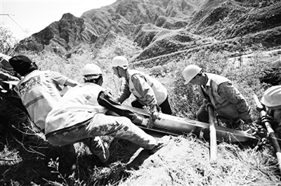 有危石的地区都是野山,根本没有路,重以吨计的工具、钢筋、材料都要手抬肩扛,一点点运上山。然后,定位、放线、打孔……工人们要吊着安全绳索从悬崖断壁上垂直而下,有时一点儿踩头都没有,只能悬空作业。“刚开始,根本不敢往下看,干完活,脚踩实地,腿肚子还转筋呢。”老杨说得实在。