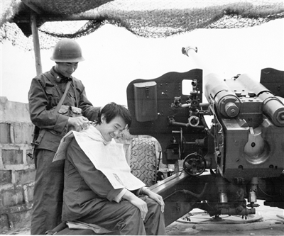对一般的摄影爱好者来说,战场难以身临其境,尽管也有摄影记者到战地采访拍照,但他们毕竟不能和官兵生活、战斗在一起。到云南前线参加“轮战”,对我则是天赐良机,投了几张新闻图片,被报社采用还获了奖。其中《战地理发》获得了云南省摄影大赛特等奖。照片内容是一名战士坐在炮架上,把报纸掏一个窟窿套在头上,代替理发的围裙,另一名战士手拿推子为他理发。