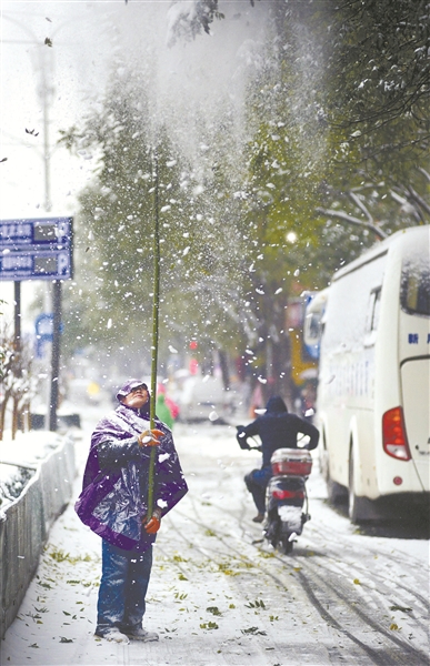 自21日夜间起,北京迎来强降雪天气,本市各有关部门及早启动应急预案,采取多种措施确保道路出行安全、居民家中室温达标、道路不结冰、电力系统稳定。当天,“竹竿除雪队”也出现在街头,一根十余米长的细竹竿和一个雨披就是除雪队职工的全套装备。随着挥动的竹竿,大片积雪从树上落下形成了一片片雪幕。为了防止积雪压断树枝,园林部门组织起“竹竿除雪队”进行人工除雪,保障市民出行安全。相关新闻详见第3、第8版