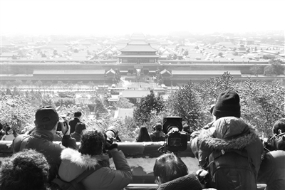 小雪时节,一场大雪为初冬的北京增添了喜庆。昨天上午,天空放晴,记者在景山公园万春亭看到,人们纷纷架起相机,拍下了故宫的美丽雪景。