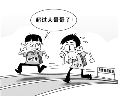 不久前,《中国青少年体育发展报告(2015)》发布。《报告》集中反映了近年来中国青少年体育领域的基本状况和主要进展。作为其中一大看点,多项身体素质检测显示,大学生身体素质不如中学生。