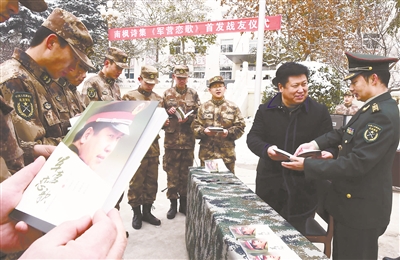 本报讯 (记者 于彧 )昨天,诗人南枫走进军营举行新诗集《军营恋歌》首发式,现场为战友签赠新诗集、朗诵了创作的军营诗歌。