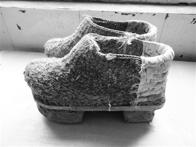 草鞋是用芦苇的毛樱子和草麻纤维一同拧成的,鞋底用木头加工而成,打好的草鞋里,塞上软软的麦秸或一团棉花,穿起来非常暖和,木质草鞋底一般有十公分高,用锯子锯成桥孔状,既可以在雪地里踏雪,又可以在泥水里走路,不论多么寒冷或地上积雪泥水多深,一点也不冻脚和湿鞋。