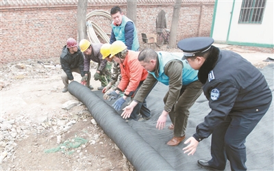 12月8日7时—10日12时,本市首次启动“空气重污染红色预警”。此前,市应急办已发布空气重污染橙色预警信号。昨天,石景山城管部门会同公安、交通、环保等部门针对渣土运输车辆开展设点检查,特别是加大夜间执法力度,严控污染行为的发生。图为石景山城管队员对辖区一家工地进行检查时,发现苫盖渣土的苫布有破损问题,当场要求更换新苫布,并与工人一起将渣土进行严密覆盖。