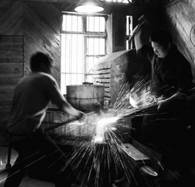 最吓人的就是有一回,打着打着,大锤头木柄突然折了,锤头从正弯腰指点的师傅头顶呼啸而过,重重地砸在了厂房的砖墙上,那才真正的叫命悬一线呀。假如真因一时不慎,给师傅来个“万朵桃花开”,如何向师娘交代!
